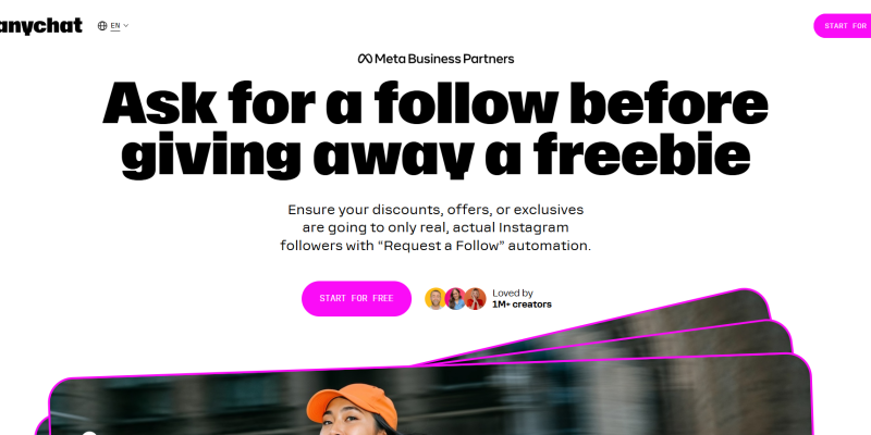 Manychat pozwala tworzyć inteligentne przepływy chatbotów na Instagramie, Messengerze i WhatsApp - bez konieczności kodowania.